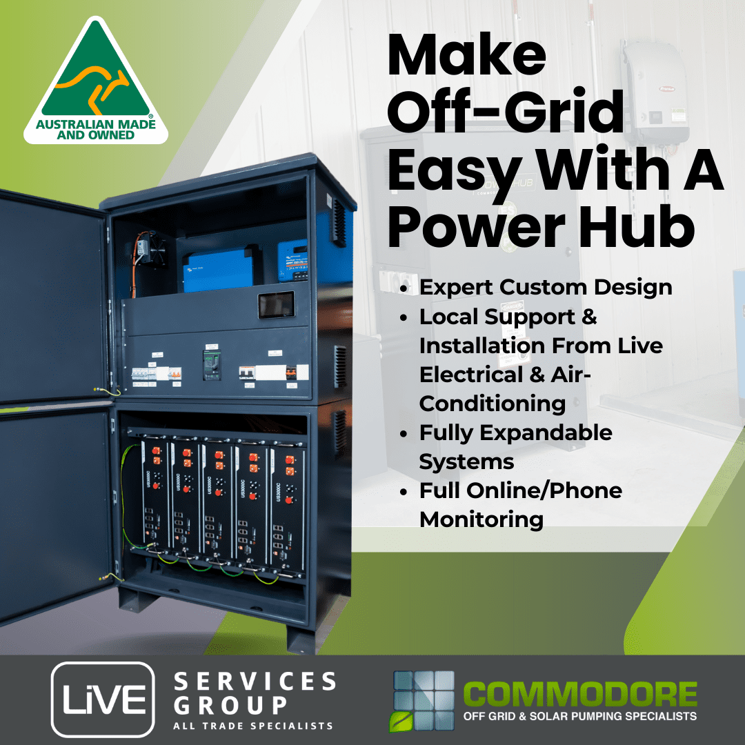Off-grid Solar Systems: Our solar team have partnered with Commodore Solar to provide customers in remote or inaccessible locations with the freedom and reliability of running their own off-grid solar system. Our systems are integrated to withstand extreme weather conditions and optimised for your unique energy requirements to ensure reliability, efficiency and cost-effectiveness.